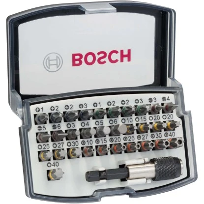 Das Bosch Schrauberbit-Satz verfügt über eine überdurchschnittliche Härte und bewältigt problemlos die unterschiedlichsten Anforderungen. Das Set besteht aus 32 verschiedenen Schrauberbits. Praktischerweise wird das es in einem kleinen und kompakten Etui mit transparentem Deckel geliefert. So haben Sie immer alles griffbereit.