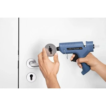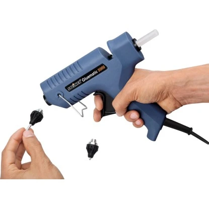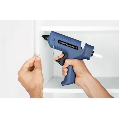 Die Steinel Klebepistole Gluematic 5000 ist eine handliche Heißklebepistole für Hobby und Handwerk. Mit der kompakten aber leistungsstarken Klebepistole lassen sich verschiedene Bastelarbeiten und kleinere Reparaturen umsetzen. Dabei überzeugt die Gluematic mit einem Wärmespeichersystem und kann überall und jederzeit eingesetzt werden. Sie können beispielsweise Holzdübel beim Möbelaufbau fixieren oder Bilderrahmen kleben. Beim Basteln, DIY-Projekten oder im Modellbau ist sie ebenfalls ein nützlicher Helfer.