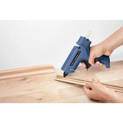 Kabellose Heißklebepistole Das Besondere an der Gluematic 5000 ist die kabellose Verwendung. Mit einer integrierten Wärmespeicherung kann die Klebepistole anschließend für 20 Minuten kabellos zum Kleben verwendet werden. Für großflächige Klebearbeiten wird das Kabel der Ladestation einfach umgesteckt und die Pistole an die Stromversorgung angeschlossen.