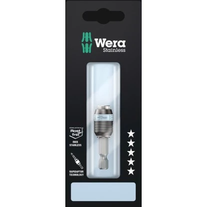 Der Wera Bit-Halter Universal 3888/4/1 K Rapidaptor eignet für die Aufnahme von Bits mit 6,3 mm (1/4″)-Außensechskantantrieb nach DIN ISO 1173-C 6,3 und E 6,3 (ISO 1173). Aufgrund seiner Edelstahlausführung wird Fremdrost vermieden. Die Rapidaptor-Technologie erlaubt eine Aufnahme der Bits auch ohne Betätigung der Hülse. Durch einfaches „Nach-vorn-Schieben“ können die Bits entnommen und blitzschnell gewechselt werden – sogar mit nur einer Hand.