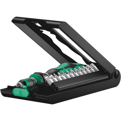 Die 14-teilige Wera Bit-Set-Box Kraftform Kompakt 50 verfügt über einen Handhalter mit Schnellwechselfutter „Rapidator“ und einen mehrkomponentigen Kraftform-Griff für ermüdungsarmes Arbeiten. Die Bajonettklinge lässt sich im Griff versenken und ermöglicht so auch schnelle Handbetätigungen in räumlich beengten Arbeitssituationen. Das Bit-Set eignet sich perfekt für hand- und maschinenbetätigte Verschraubungen.